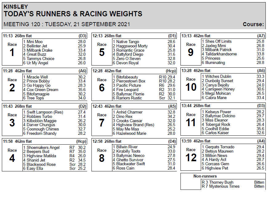 Kinsley Greyhound Betting Tips Track Information Page Here are the latest racecards form stats and results for Kinsley where racing takes place on Tuesday Friday and Saturday. Racecards form betting and tips for meetings at HarlowPerry BarrHenlowMonmoreSheffieldYarmouthDoncasterCrayfordHoveRomfordRomfordCrayfordTowcesterNewcastle.
