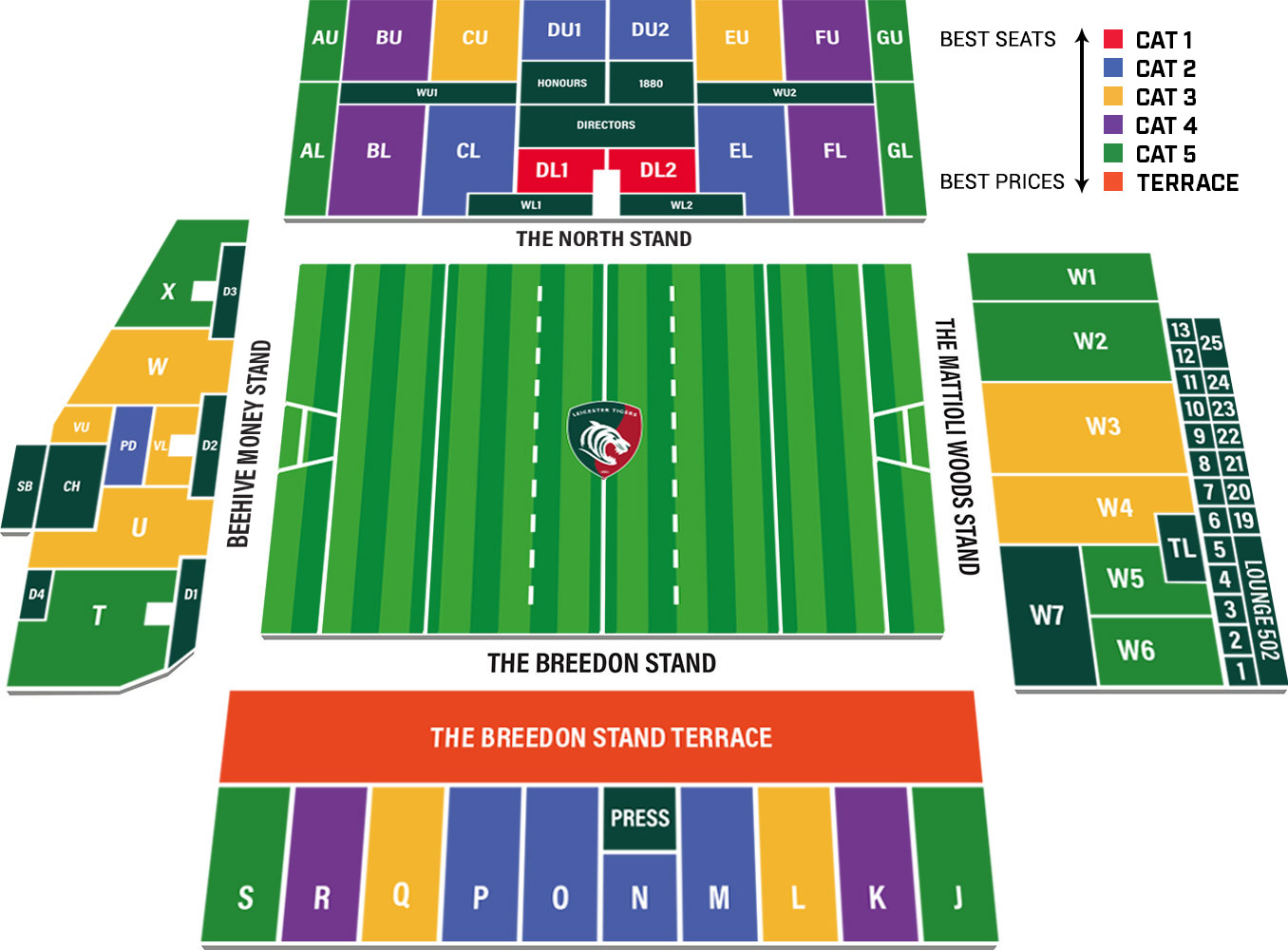 Mattioli Woods Welford Road. The number of rows for the field level sections will greatly vary but will begin with row 1 and go no higher than row 30. The home of Leicester Tigers since 1892 the Mattioli Woods Welford Road has been the backdrop to the clubs rise from its founding years to becoming English rugbys most successful team.